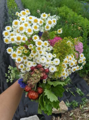 Growing Feverfew in the past, I was always unimpressed with short stems. In Zone 6b, transplanted in the fall, these babies bloomed in mid May with a great harvest window and were easily 40″ tall. The sunniest, cheeriest of bouquet fillers for late spring and early summer arrangements. Growing again in 2022!