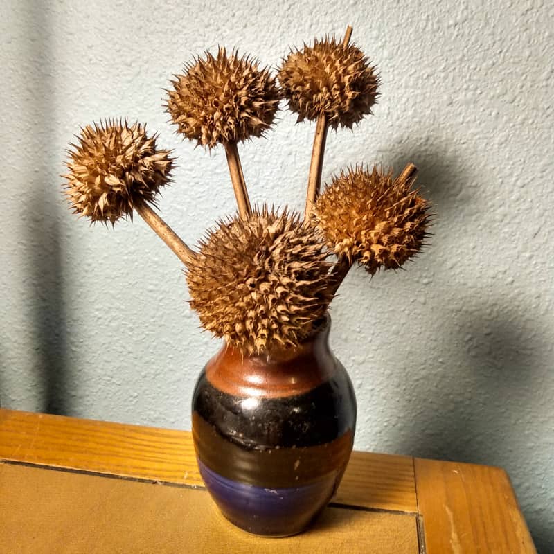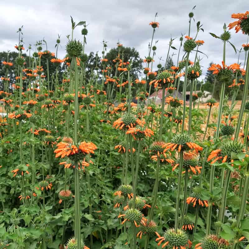 Delightfully unique tubular orange flowers appear on spiky pincushion-like spheres that form at intervals up stems. Klip Dagga is very easy to grow and absolutely stunning in late summer waving in the breeze. Plants grow 8-12′ tall and may require staking late in the season and in high wind areas. All parts of the plant, especially flower petals, have wide ranging medicinal uses and are said to have a mild calming and euphoric effect. Hummingbirds have turf wars over this plant, perhaps because they use it medicinally, too. Regardless of their motivation, we highly recommend Klip Dagga for planting where you can watch the hummingbirds go wild for this plant. The pincushion flower bracts are difficult to handle but fun to look at and are interesting in dried flower arrangements. Related to Lion’s Tail/Wild Dagga, but easier to grow and more productive. May self-sow. Native to Southern Africa where it is called Cordao. Aka, Devil’s Pincushion.
