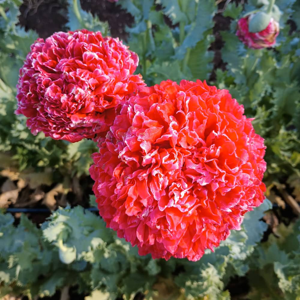 An impressively ruffled, bright red peony poppy with slight frosty edges that is sure to get your attention. Peony poppies are known for producing larger flowers that are fully double, and Lucille sports a poof of petals that seem unending. Our stock seed for this variety is from Wild Garden Seed, where it was isolated out of a mix of peony poppies. Named in honor of the one and only Lucille Ball, as suggested by Helen Dzubia. Strong stems grow to 4’. Tan seeds.