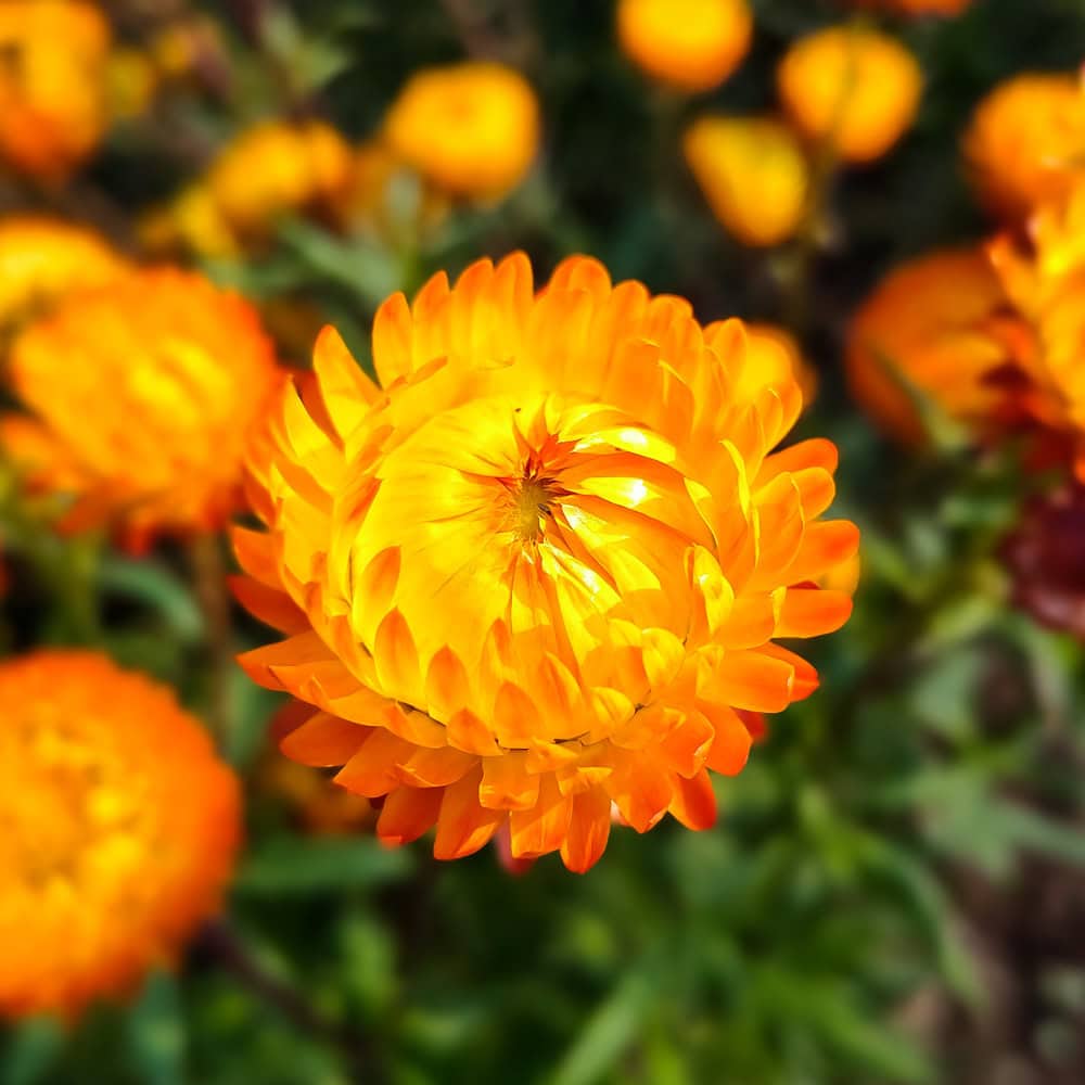 Striking, fiery red and orange colored strawflowers were selected out of the classic Monstrosum Mix. We selected this variety over many years in an attempt to produce a stable, single color. However, Firefly strawflower had other plans, and continues to provide a diversity of flame-like color combinations. Producing both light and dark orange petals with varying degrees of red accents, Firefly would be good design inspiration for a spaceship or rocket engine. The papery blooms make great additions to dried flower arrangements and wreaths. Tall plants grow up to 3.5’ tall and are covered with 1.5″-2.5” flowers that can even stand up to a few light autumn frosts, providing loads of strawflowers continually from July through October in many areas. Aka. Helichrysum.