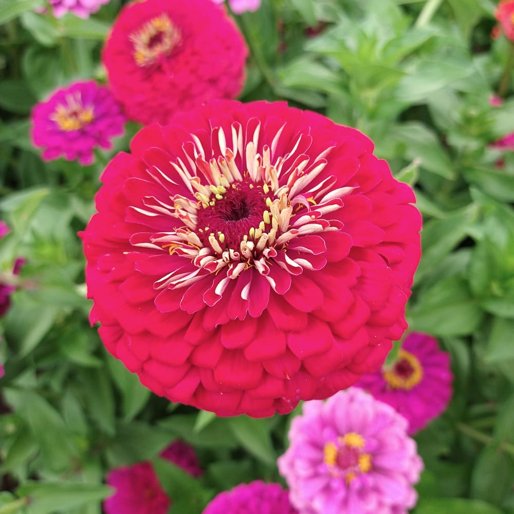 A gorgeous mix of berry-toned zinnias, including raspberry, strawberry (and strawberry ice cream), marionberry, and grape (concorde, merlot, and rosé). Perhaps we can pretend that grapes are berries, and that rosé is a grape variety just this once. If you like a full spectrum of pink, this is the mix for you. A great cut flower, with long, strong stems that will last in a bouquet for 7-10 days. Flowers are fully double. Plants reach 3-4′ and will bloom from July through frost, especially if picked regularly.