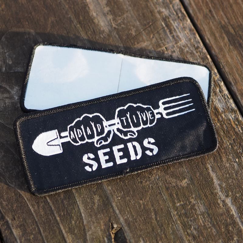 Adorn your gear with an Adaptive Seeds knuckle tattoo patch! Black patch with white design features fists holding a shovel and a pitchfork (or is it a spoon and a fork?) in a nod to our Seed Ambassadors Project logo of sticker rainbow fame. Fists have knuck tats that say “ADAPT-TIVE” positioned above larger stencil-style text that reads “SEEDS.”