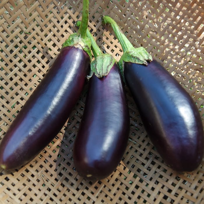 Astrakom is possibly the best eggplant for short season climates or for those who struggle to get the larger fruited types to produce well. Deep purple, elongated teardrop-shaped fruit are smaller and a bit earlier than Diamond. Compact plants produce lots of medium-small (about 4” long) fruit, perfect for folks who like cute smaller eggplant. Very attractive on a plate when sliced in half lengthwise and roasted. Small plants grow to about 2′, making this variety very suitable for container growing. Originating from one of the many Soviet era breeding programs and was named after the Russian city of Astrakhan, located on the Volga River. It was introduced to North American growers by Belorussian seed saver Andrey Baranovsky.