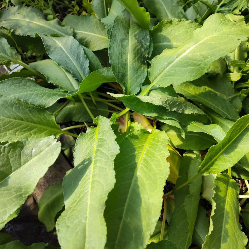 A semi-wild perennial with a long culinary history in Central and Eastern Europe that is right at home with Transylvanian Sorrel, Buck’s Horn Plantain, and Salad Burnet. Patience Dock can be used as a salad green while young, although best used as a sauté green (cooked like spinach) when slightly more mature. Leaves have a mild, slightly lemony flavor and have a high mineral content, but also contain oxalic acid and are best not consumed in extreme quantities. Greens sprout early in the spring to fill in the hungry gap before the annual garden gets going and can be harvested through early June. Plants form an unassuming basal rosette and grow to about 12” across with strap-shaped leaves that grow to 1-2’ long. This is the kind of plant to stash in the back of the garden, where it will pretty much take care of itself until you need it – but be sure to cut the flower stalk before the seed is mature if you don’t want it to spread. Drought tolerant but may go dormant in the summer. Check out this great video for more!