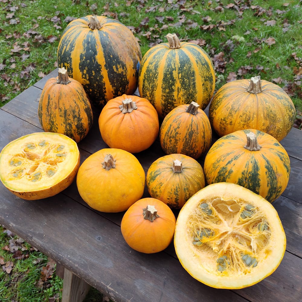 Hulless pumpkin seeds (aka, pepitas) are some of the tastiest and most nutritious treats that one can grow in the garden or farm field. They are mind bogglingly delicious when freshly roasted with a little salt. So why not grow your own with Emerald Naked Seeded pumpkin? Our friend Chris Homanics has been working with hulless pumpkins for years and has developed the most incredible genepool we could imagine: Little pumpkins, big pumpkins, green striped or all orange on the outside. Not all of the pumpkins will make good eatin’ (however some of them will) but that is not the goal. Emerald Naked Seeded pumpkin is an interbreeding population whose goal is to discover what is possible and provide tons of green naked pumpkin seed along the way. Hulless pumpkin seeds have traditionally been used in Mexico for mole sauces and in Austria for pumpkin seed oil. We love the toasted seeds in salads or simply as a snack dusted with salt and seasoning. Seeds are easy to scoop out of the fruit, then when rinsed and dried will store for a year long stash of snackin’ goodness. Pepitas are high in protein, essential fatty acids, fiber, vitamins and minerals. The breeding work for this variety can be traced back to Ken Ettlinger’s (Long Island Seed Project) Little Green Seed and other Styrian type pumpkins. Chris received his original seed from Holly Dumont of California who had further selected Ken’s work.