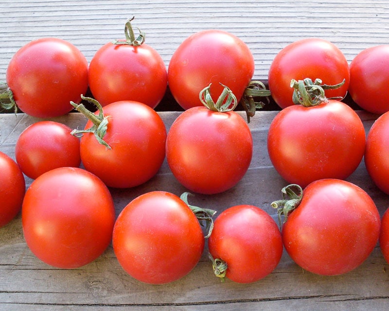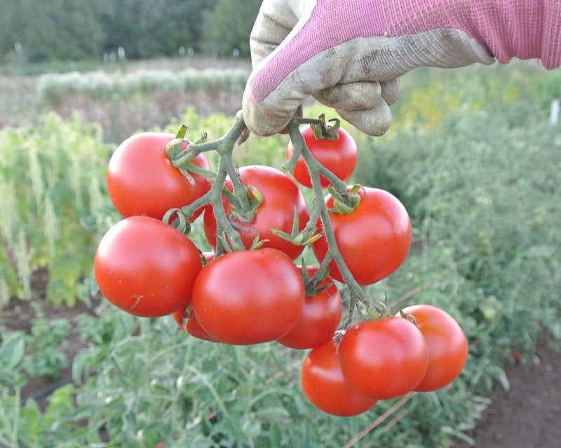 Huge amounts of 1½-2” perfect ballshaped, 2-3 oz fruit form in clusters of 7-8. Red and juicy with good tart tomato flavor. Good storing ability both on and off the plant. Deutsche Fleiss translates to ‘German diligence.’ It is consistently one of our highest yielding varieties. A Seed Ambassadors Project variety sourced from Gerhard Bohl, a seed collector in Germany. He said that out of the thousands of tomato varieties he’s collected, Deutsche Fleiss is one of his favorites, and we can see why!