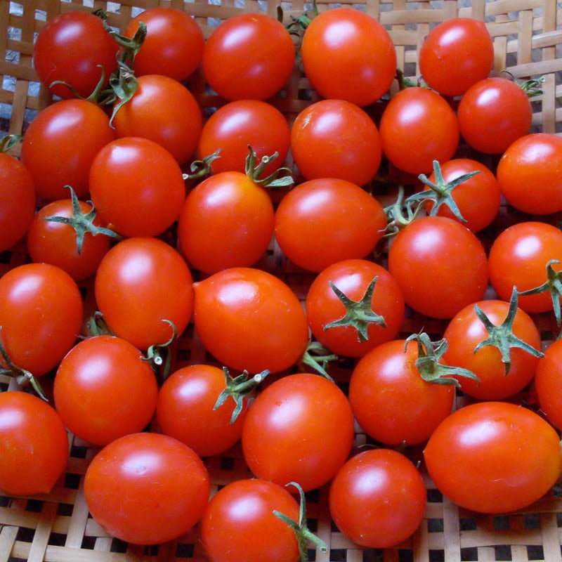 Selected from crosses between humboldtii wild tomatoes and Solanum habrochaites, this is one unique tomato. Multi-flora type has clusters of dozens of fruit – possibly up to a hundred. Red cherries weigh about ¼ oz with a cute point on the blossom end. Compact growth habit is uniquely indeterminate, ripening in several determinate batches that provide a full season harvest. One of the many excellent tomato varieties originally bred by Dr. Alan Kapuler of Peace Seeds in Corvallis, Oregon.