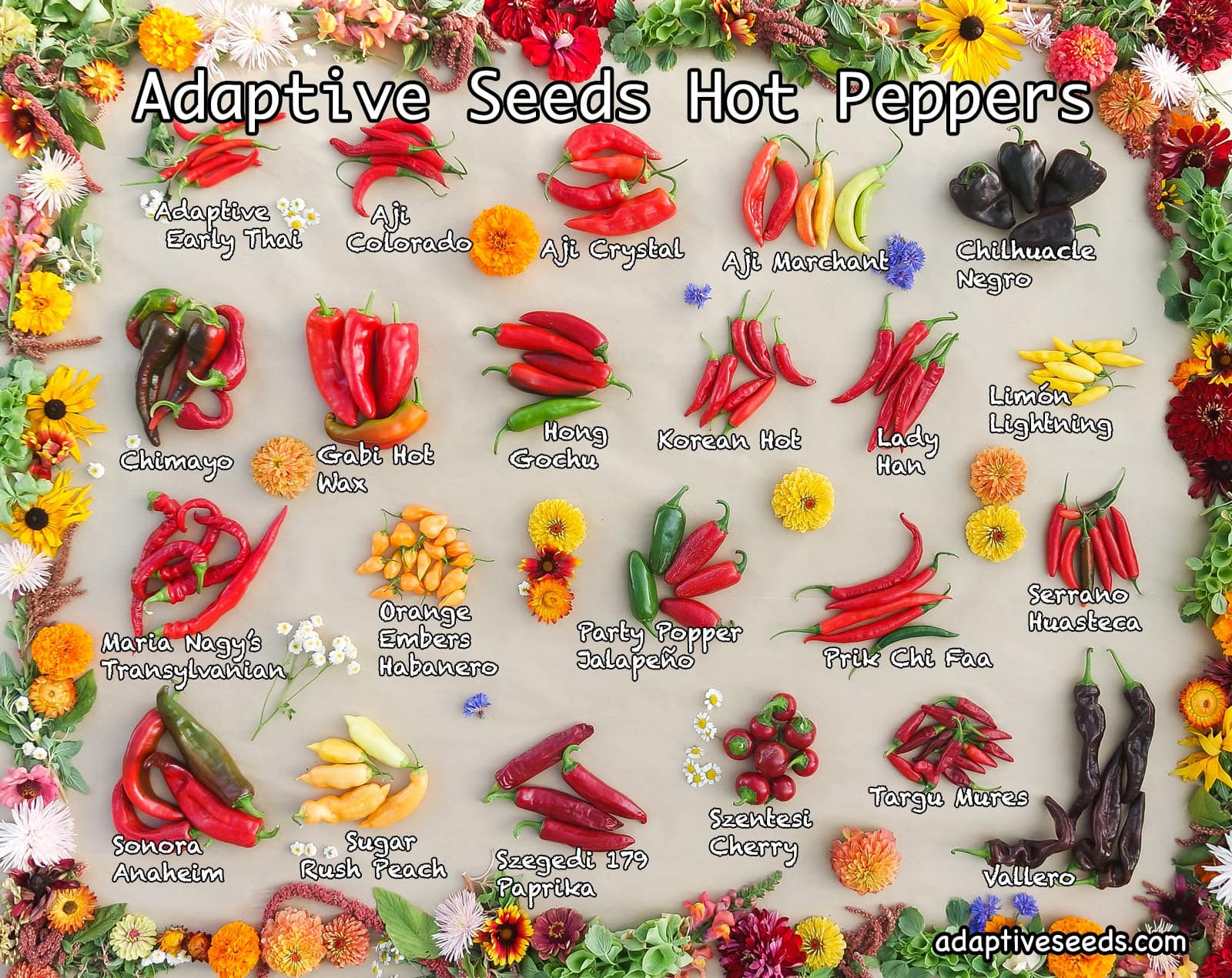 Capsicum annuum. Hot. 90 days. In 2003 we had our first experience working on a farm in Willow Creek, California. That year Andrew saved his first seeds, too: an heirloom tomato, and a Thai pepper. Now, 17 years later, the legacy of that first saved seed lives on in the Adaptive Early Thai pepper. We’ve…